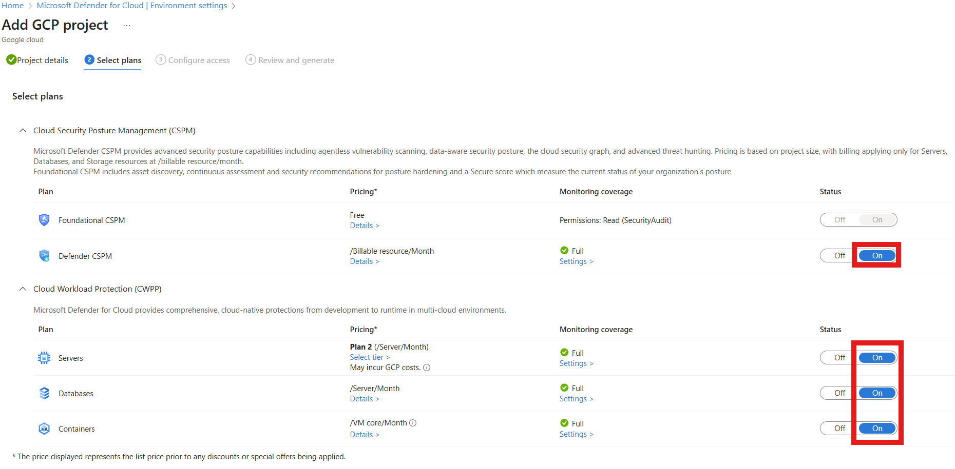 Follow the on screen instructions to configure access between Defender for Cloud and your GCP project.