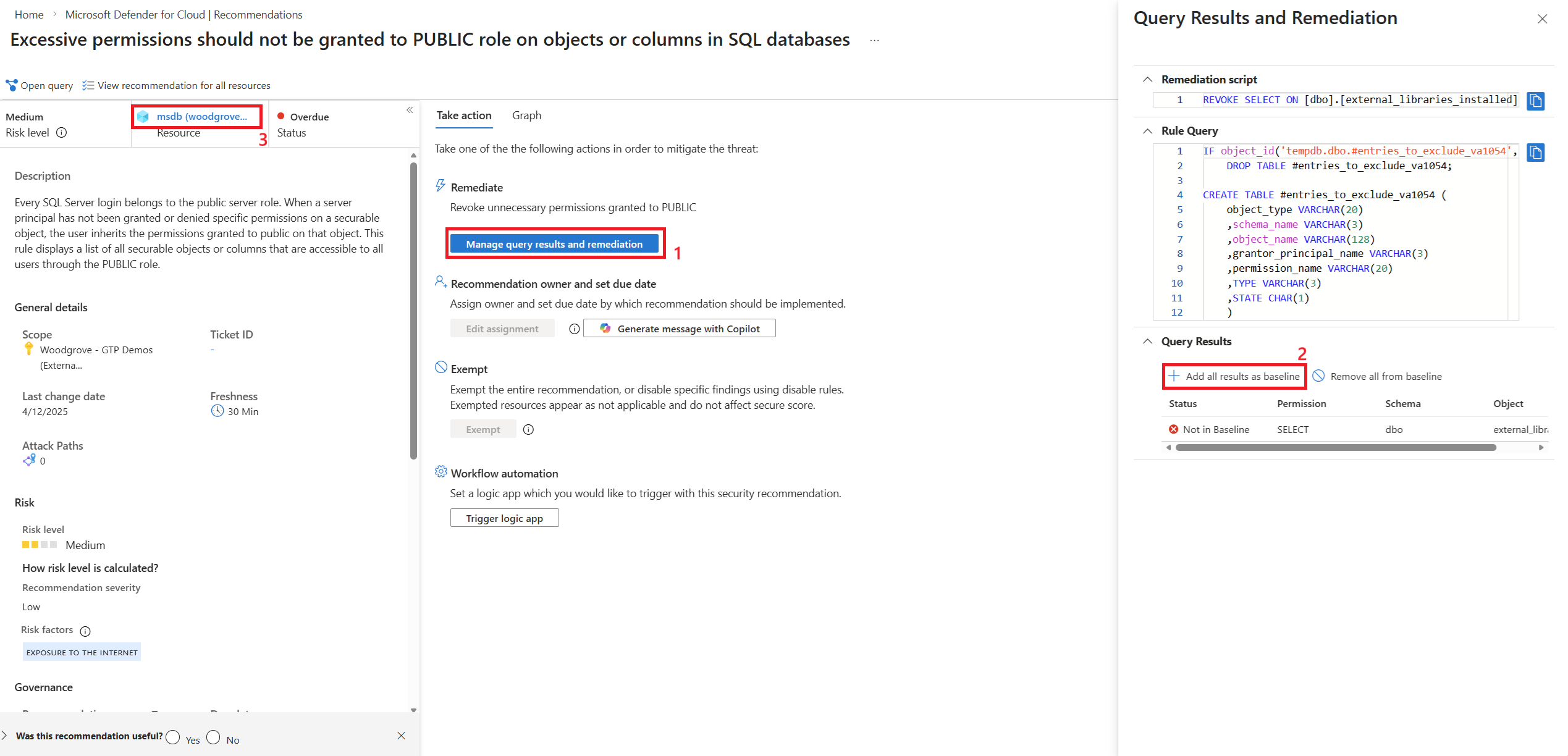 Select Manage query results and remediation to review the query used for evaluating the recommendation, generate a remediation script, or set a baseline.