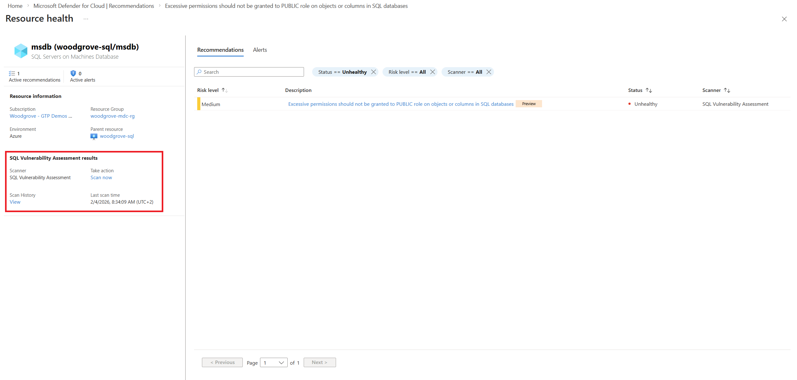 In the database’s Resource health page, review the recommendations generated for the resource, trigger a SQL VA scan, or go to the SQL VA scan history page.
