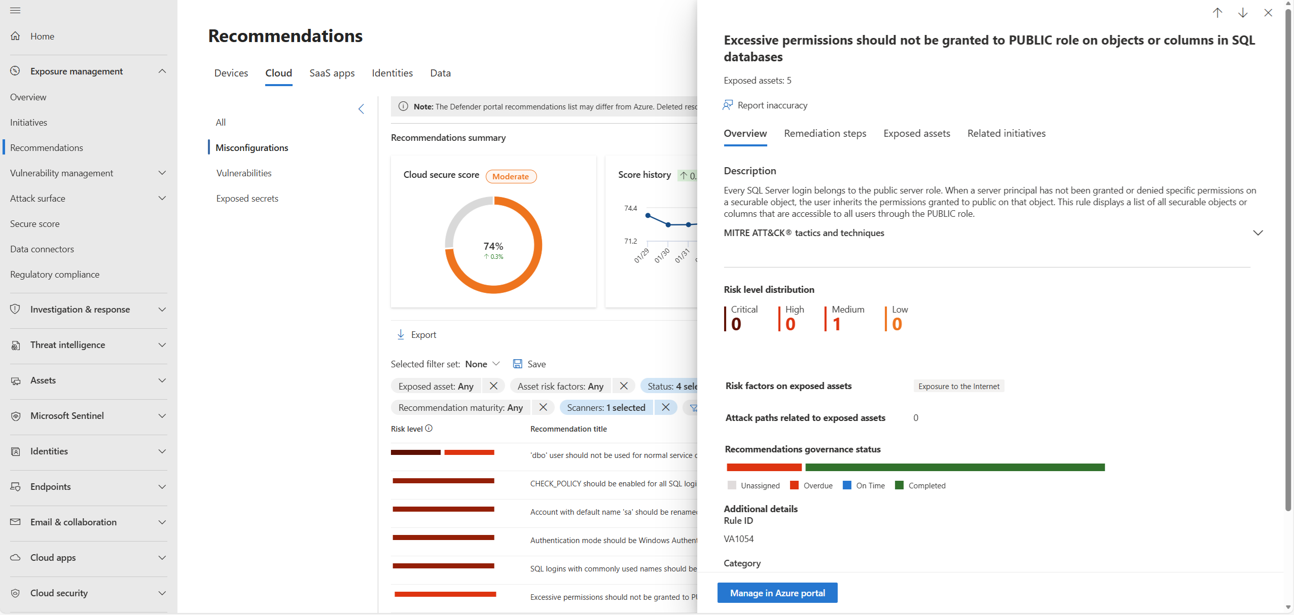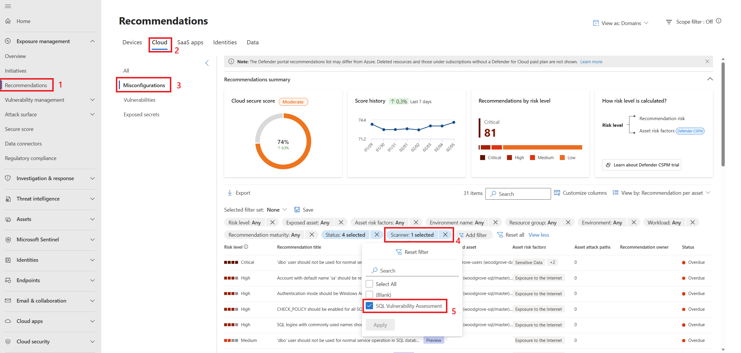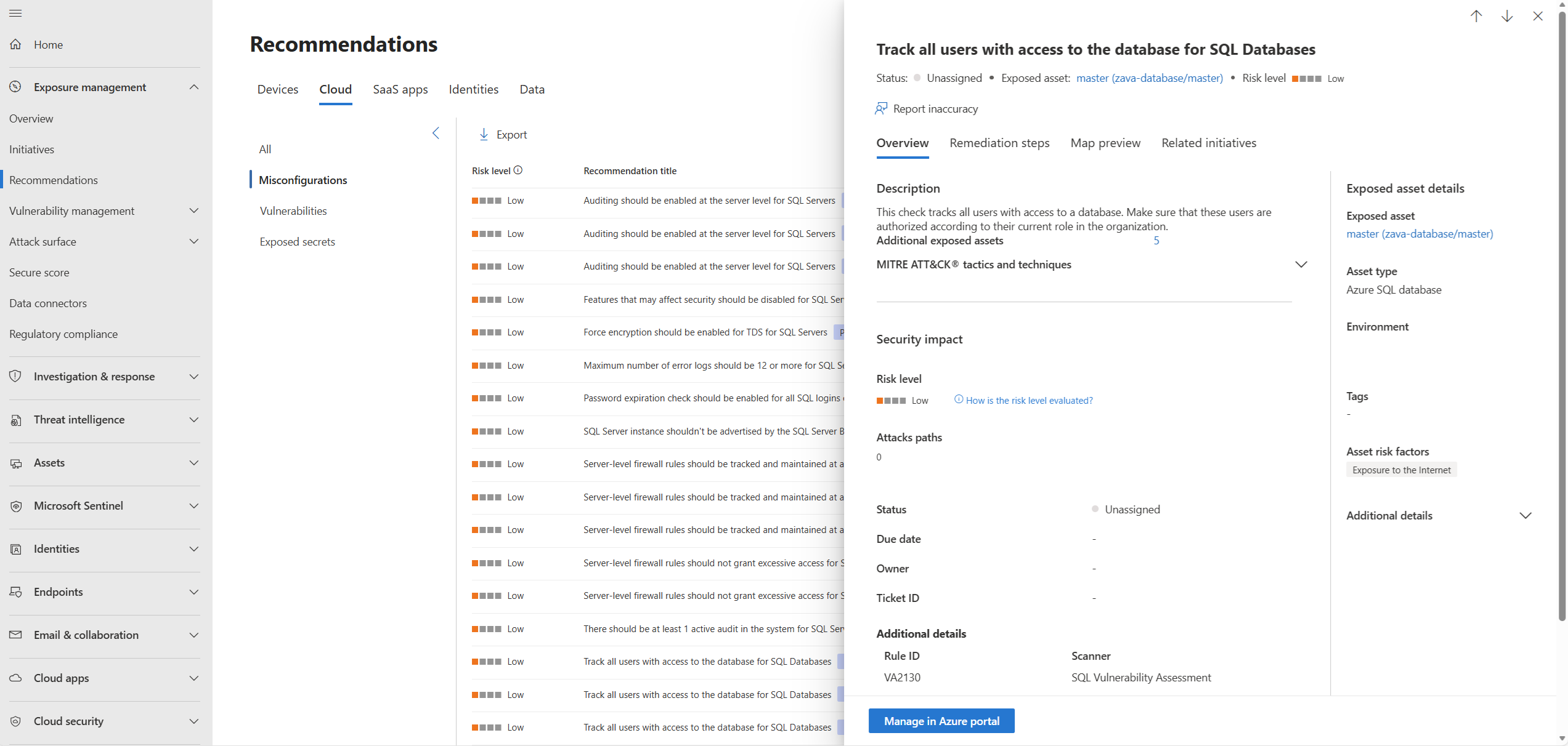 - SQL Vulnerability Assessment findings follow the same recommendation structure used across Microsoft Defender for Cloud.