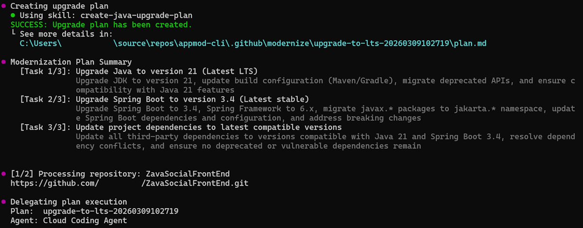 modernize(interactive, local)modernize→ select Cloud Coding Agents (interactive, cloud)modernize upgrade "Java 21"(non-interactive, local)modernize upgrade "Java 21" --delegate cloud(non-interactive, cloud)
