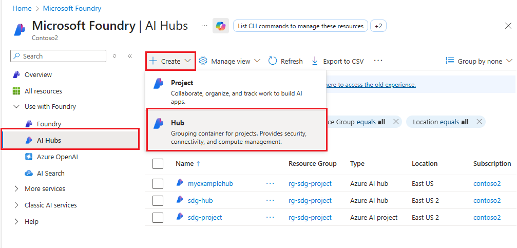 Foundry. From the left menu, select AI Hubs, and then select + Create and Hub.Enter your hub name, subscription, resource group, and location details. For Azure AI services base models, select an existing Foundry resource or create a new one. Foundry resources include multiple API endpoints for Speech, Content Safety, and Azure OpenAI.