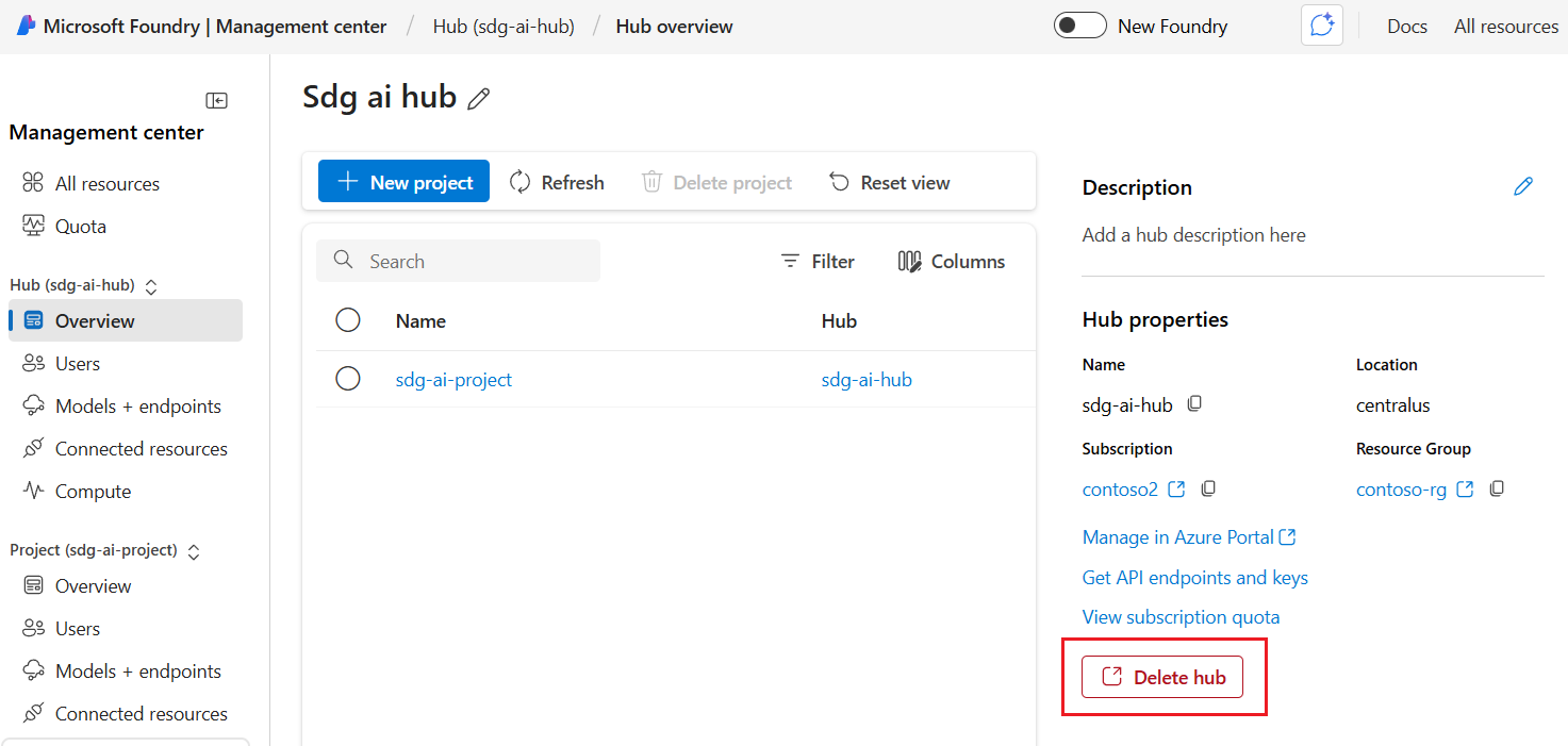 To delete a hub from Foundry, select the hub and then select Delete hub from the Hub properties section of the page.