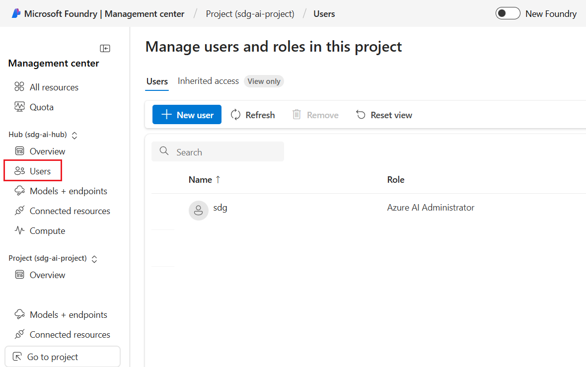 You can add and remove users from the Foundry portal management center. Both the hub and projects within the hub have a Users entry in the left-menu that you can use to add and remove users. When you add users, you can assign them built-in roles.