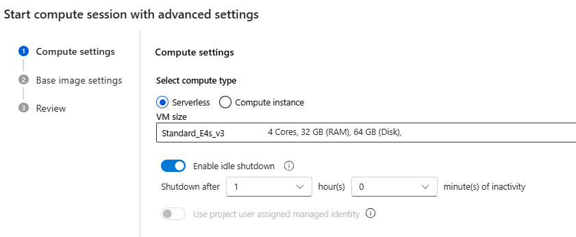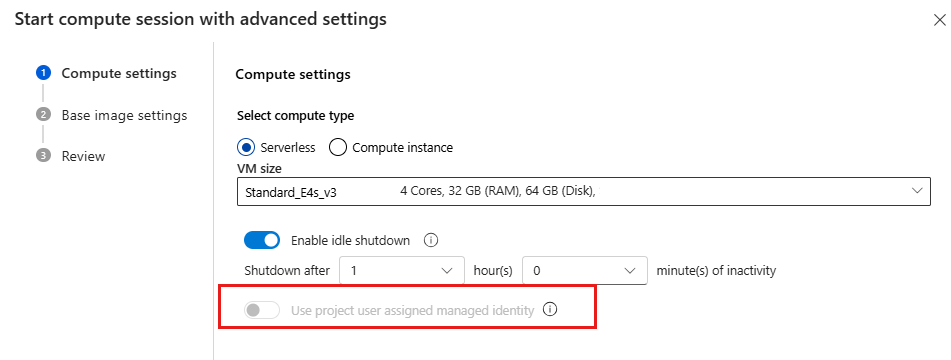 - Set the user-assigned managed identity. The compute session uses this identity to pull a base image and install packages. Make sure that the user-assigned managed identity has Azure Container Registry pull permission.