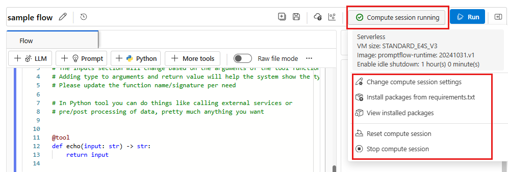 requirements.txtfile in the flow folder. - Reset compute session deletes the current compute session and creates a new one with the same environment. If you encounter a package conflict, you can try this option.