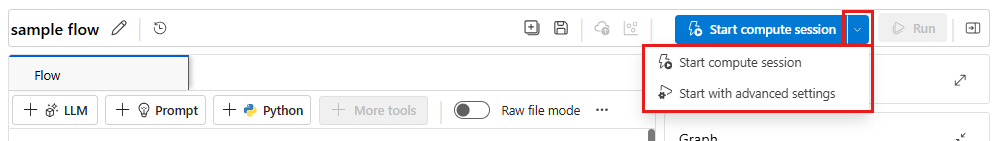 From the top toolbar of your prompt flow, select the dropdown arrow on the right side of the Start compute session button. Select Start with advanced settings to customize the compute session.