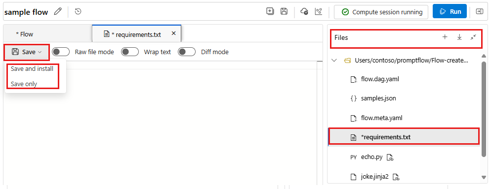 pip install -r requirements.txtin the flow folder. The process can take a few minutes, depending on the packages that you install. - Save only just saves the