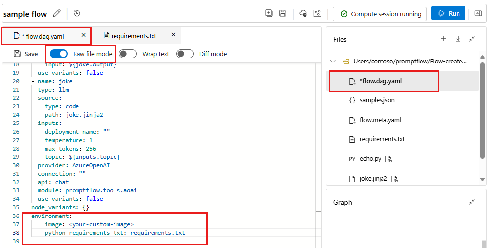 requirements.txtfile in the flow folder. For more information, see Manage a compute session.If you created a custom environment, get the image from the environment detail page, and specify it in the