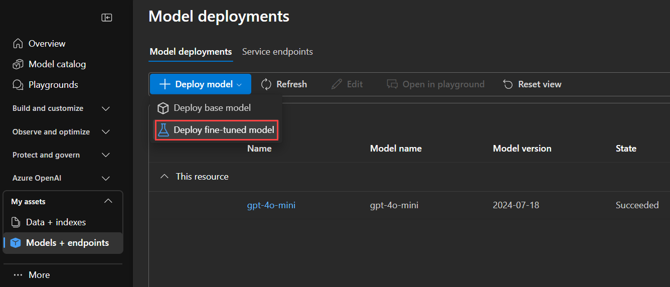 After the fine-tuning job succeeds, deploy the custom model from the Fine-tuning tab. You must deploy your custom model to make it available for use with completion calls.