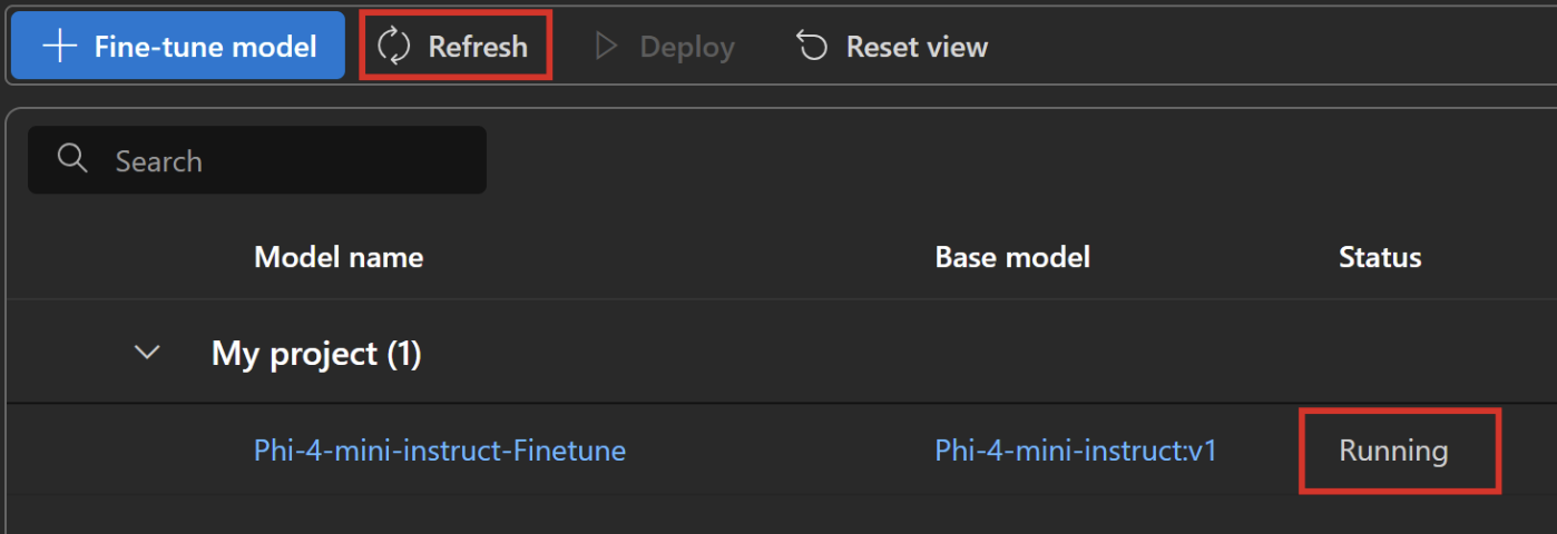 - Check the status of the fine-tuning job for your custom model in the Status column of the Customized models tab.