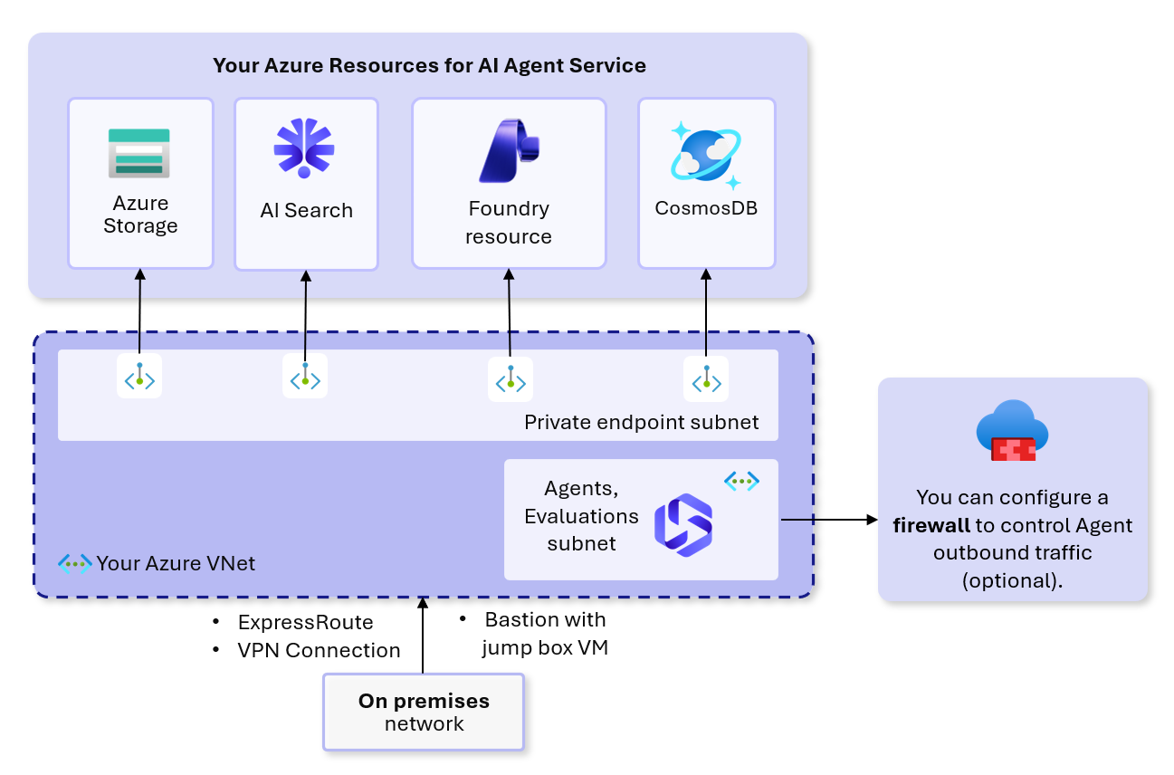 If you're building agents or running evaluations and you want end-to-end network isolation, see How to use a virtual network with the Azure AI Agent Service. That article provides details on required DNS zones, reference architecture, and known limitations.