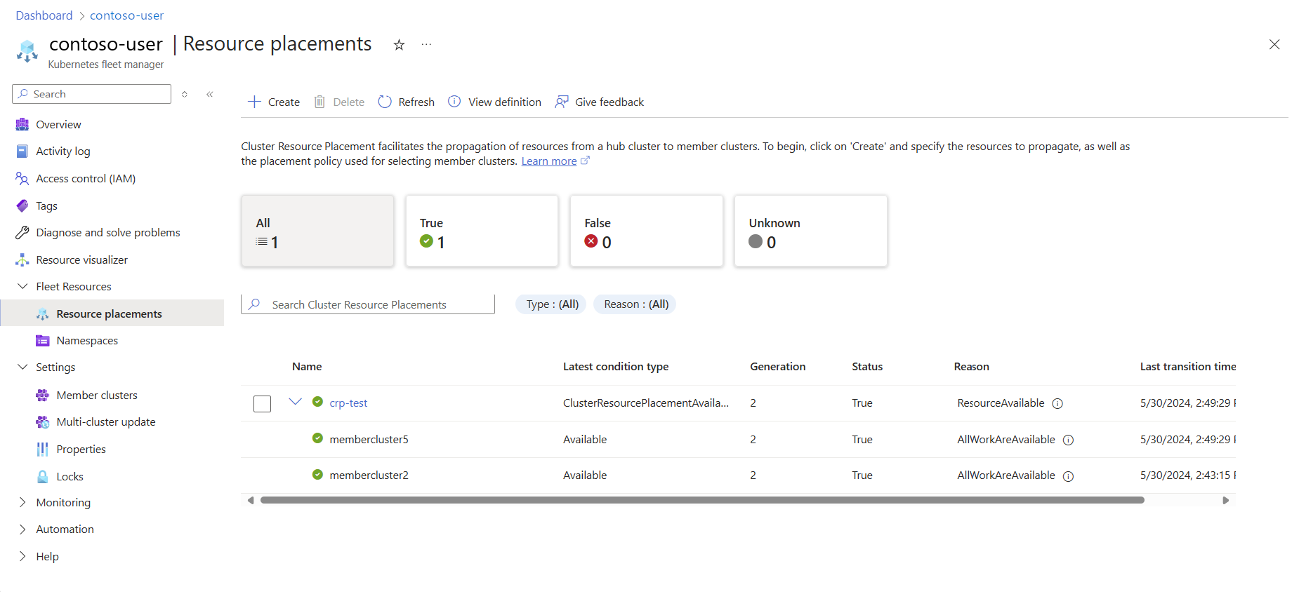 ClusterResourcePlacementby using thekubectl applycommand:kubectl apply -f cluster-resource-placement.yamlVerify that the