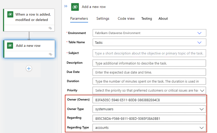 For the example Tasks table, suppose you use the Add a new row action to create a new row that's associated with other entity rows, specifically a user row and an account row. So, in this action, you must specify the IDs and lookup types for those entity rows by using values that match the expected data types for the relevant properties.