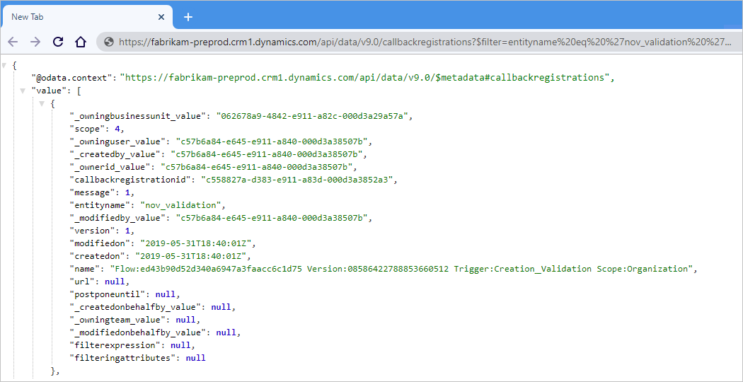 Createnotifications on an entity namednov_validationby using the following OData URI for a sample organization:https://fabrikam-preprod.crm1.dynamics.com/api/data/v9.0/callbackregistrations?$filter=entityname eq 'nov_validation' and message eq 1Note