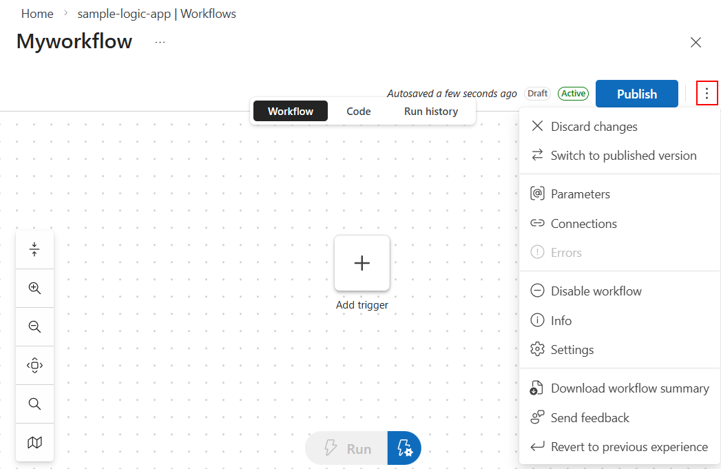 To open different views for your workflow, at the designer top, on the view selector, select Workflow, Code, or Run history.