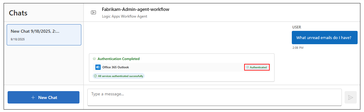 What unread emails do I have?If you previously signed in from the single user scenario, you won't get the authentication prompt again. In this case, confirm that the agent tool successfully runs and that the chat interface returns the expected results. If not, the chat interface prompts you to sign in for authentication.