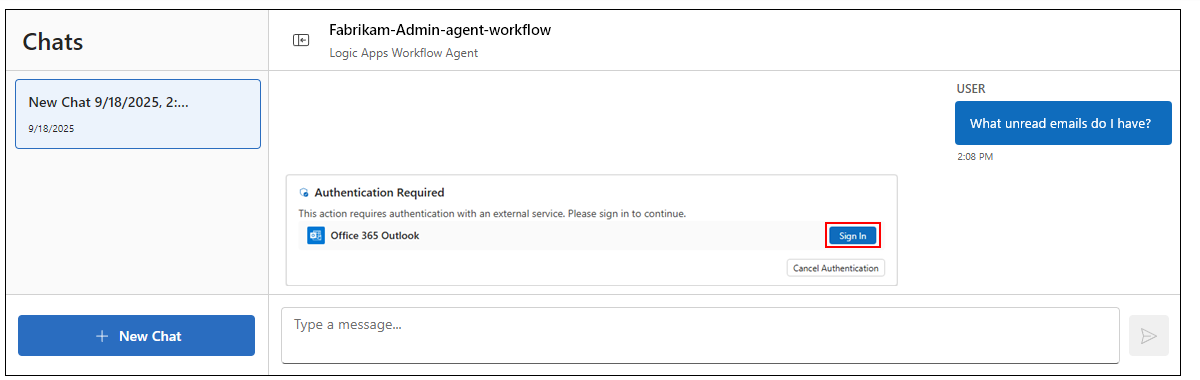 What unread emails do I have?If the agent is calling the tool for the first time, the chat interface prompts you to sign in for authentication, for example: