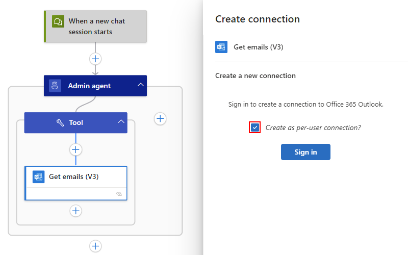 In the designer, connector actions in agent tools currently don't have a user-friendly way to show they're set up for per-user connections.