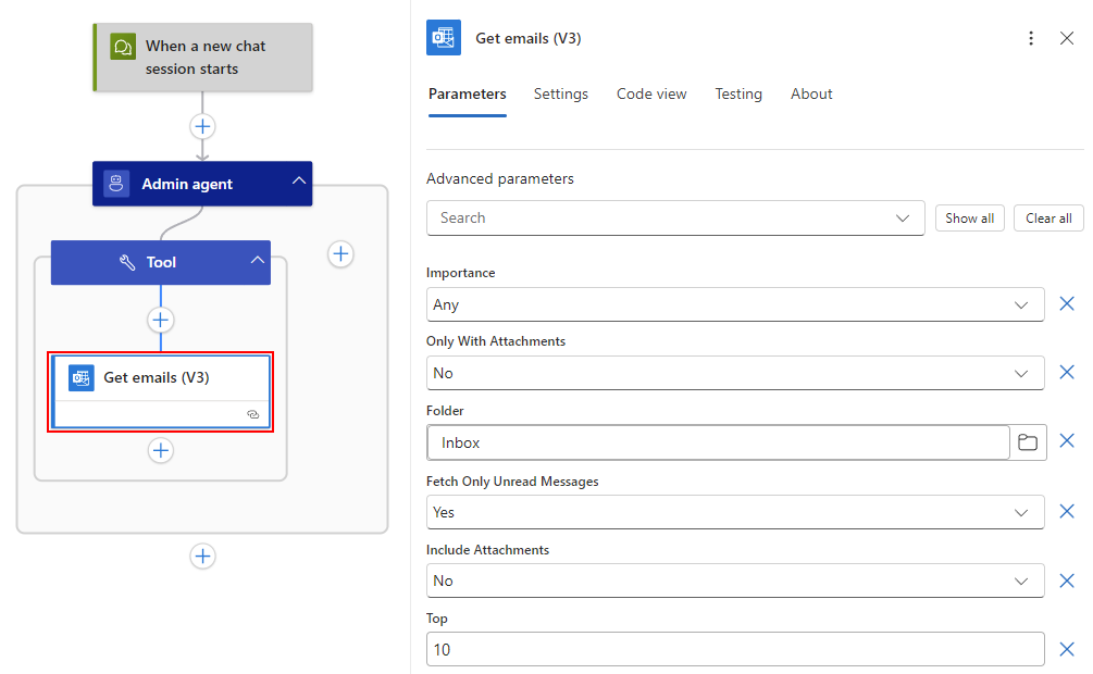 Parameter Value Description Folder Inbox The folder where to get emails. Fetch Only Unread Messages Yes Whether or not to get only unread emails. Top 10The limit on the number of emails to get. For example: