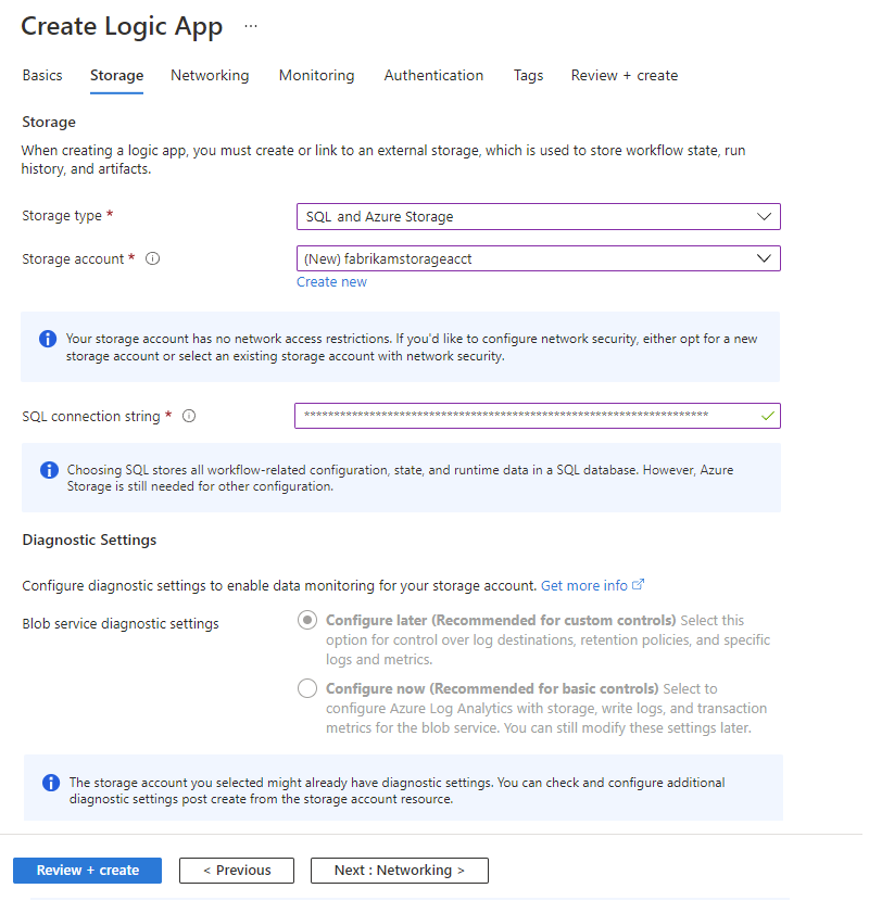 This example creates a storage account namedfabrikamstorageacct.SQL connection string Yes <sql-connection-string> Your SQL connection string, which currently supports only SQL authentication, not OAuth or managed identity authentication.