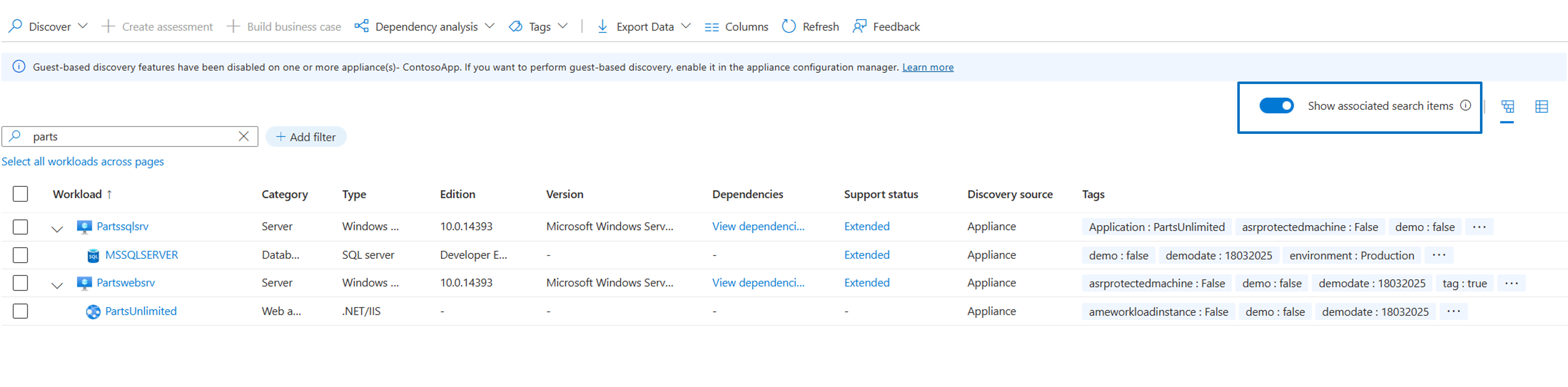 The All Inventory view helps you review all the workloads discovered from your datacenter. The list includes workloads running on servers (VMware VMs, Hyper-V VMs, physical servers, and servers running on other public clouds), databases, and web applications. You can find these workloads inline by expanding the server.