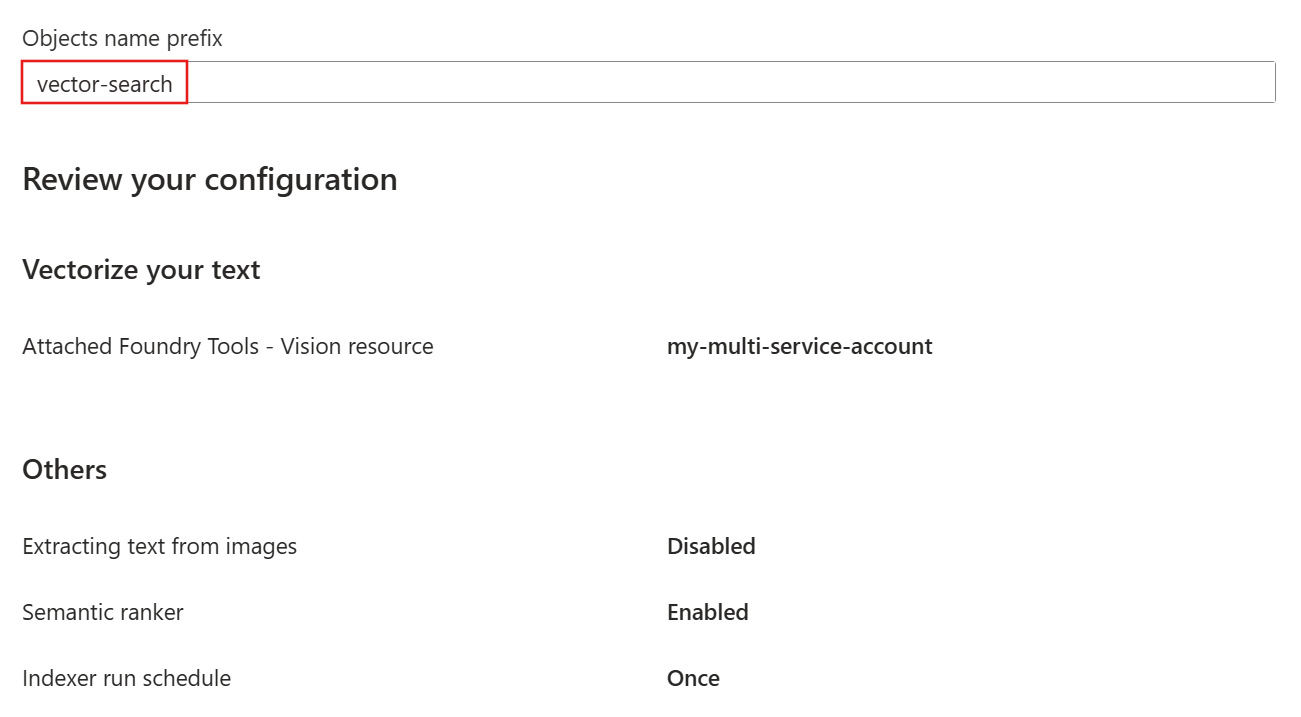 The final step is to review your configuration and create the necessary objects for vector search. If necessary, return to the previous pages in the wizard to adjust your configuration.