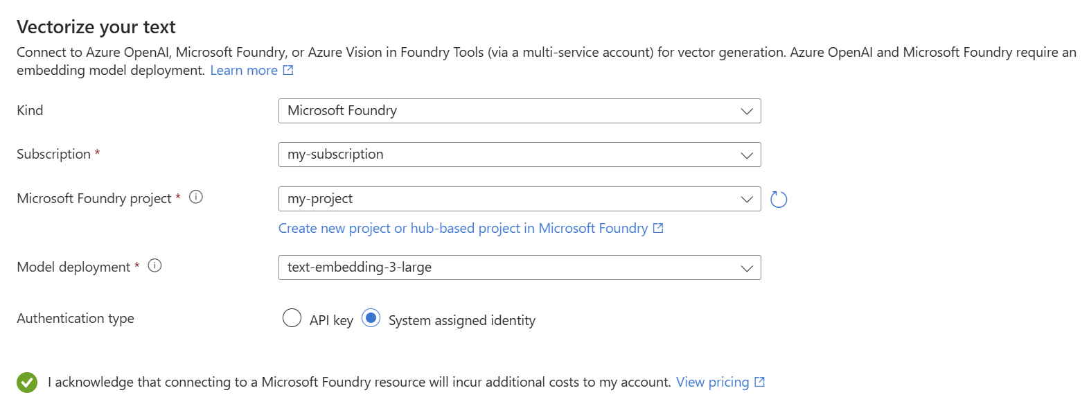 The wizard supports several embedding models from Azure OpenAI and the Microsoft Foundry model catalog. To deploy the models required for your chosen embedding model, see Deploy Microsoft Foundry Models in the Foundry portal.