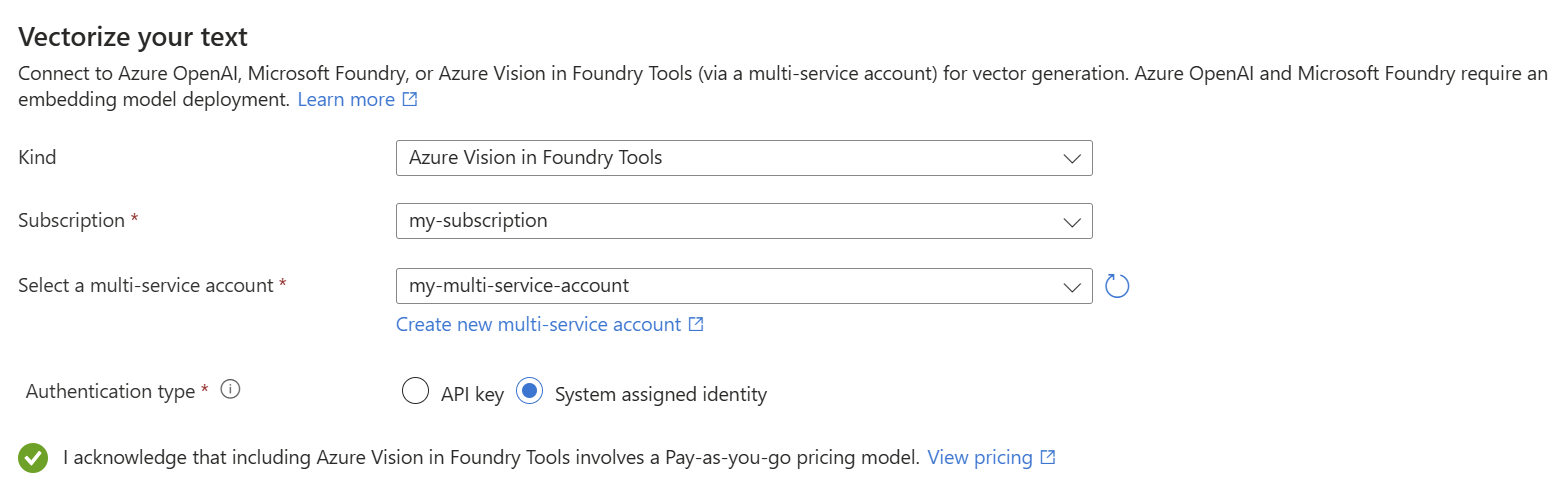 1 For billing purposes, you must attach your multi-service account to your Azure AI Search skillset. The wizard requires your search service and multi-service account to be in the same supported region for the Azure Vision multimodal embeddings skill.