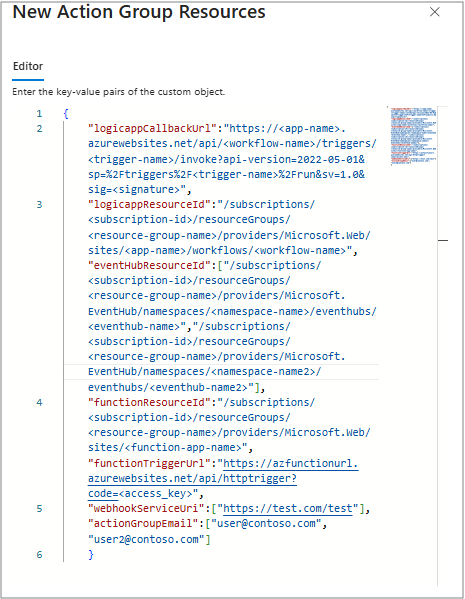 This option allows the user to set key value pairs to be added to the alerts notification payload. These properties can be used in the actions that the action group calls, such as by a webhook, Azure function, or logic app action.Existing action group resource ids: