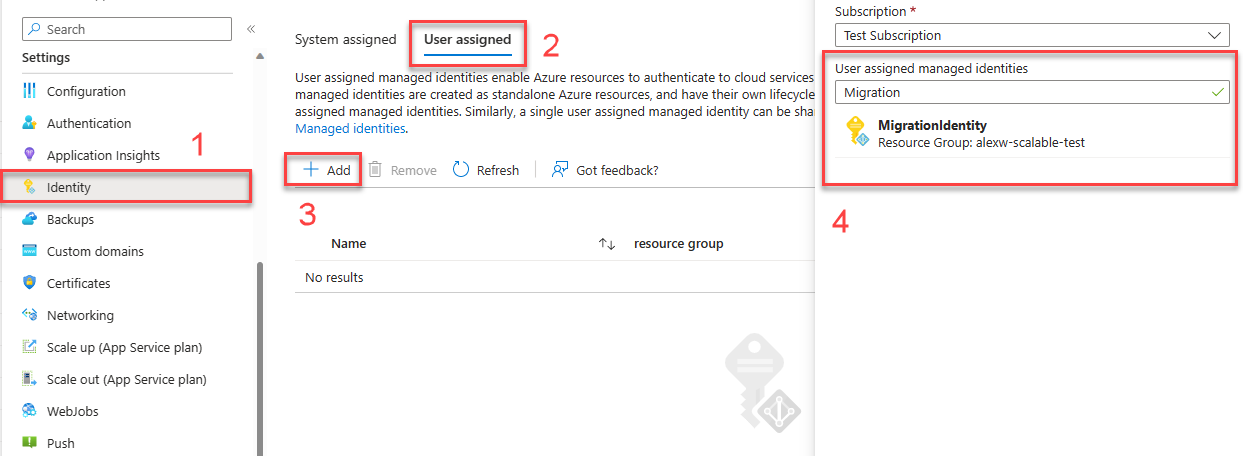 Complete the following steps in the Azure portal to associate an identity with your app. These same steps apply to the following Azure services: