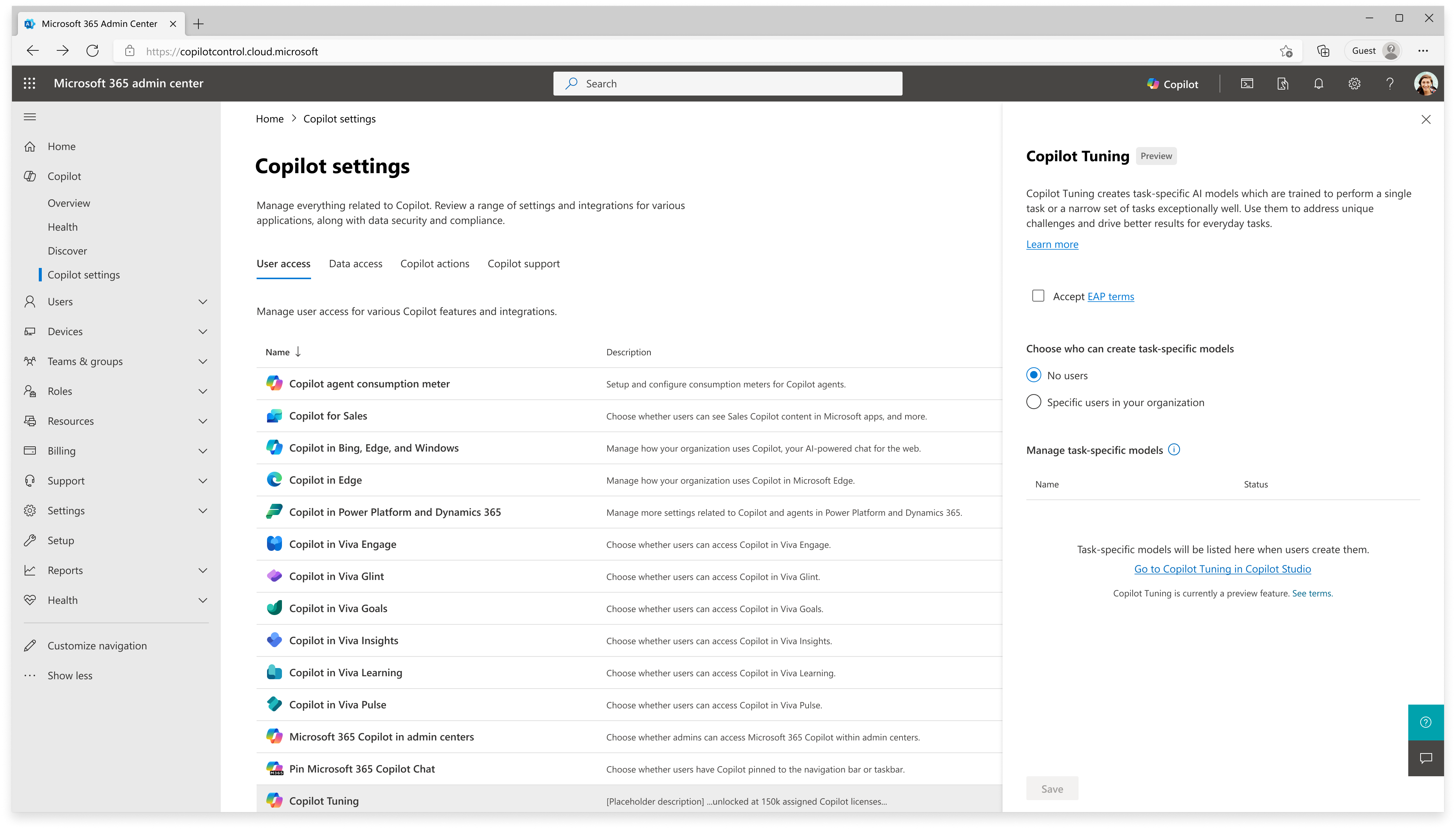 Choose Copilot Tuning, and choose Accept to accept the EAP terms.