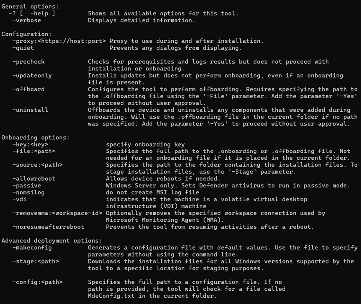 # Only absolute paths can be used for the parameters accepting paths # Configures the tool to perform offboarding. # Add the parameter "YES" to proceed with offboarding without user approval. # Offboard: False # Used with "Offboard" and "Uninstall" parameters. # Yes: False # Downloads the installation files for all Windows versions supported by the tool to a specific location for staging purposes. # Stage: # Specifies the path to the folder containing the installation files. To stage installation files, use the "Stage" parameter. # Source: # Specifies the full path to the .onboarding or .offboarding file if it is not placed in the current folder. # File: # Proxy to use during and after installation. Empty string by default. Proxy: # Prevents any dialogs from displaying. False by default. Quiet: False # Allows device reboots if needed. False by default AllowReboot: False # Prevents the tool from resuming activities after a reboot. False by default. NoResumeAfterReboot: False # Windows Server only. Sets Defender antivirus to run in passive mode. Passive: False # Installs updates but does not perform onboarding, even if an onboarding file is present. False by default. UpdateOnly: False # Displays detailed information. False by default. Verbose: False # Checks for prerequisites and logs results but does not proceed with installation or onboarding. False by default. Precheck: False # Offboards the device and uninstalls any components that were added during onboarding. # Will use the .offboarding file in the current folder if no path was specified. # Add the parameter "YES" to proceed without user approval. Uninstall: False # Optionally removes the specified workspace connection used by Microsoft Monitoring Agent (MMA). Empty string by default. RemoveMMA: # Allows offboarding to proceed even if there is no connectivity. False by default. Offline: FalseStep 3: Run the tool with the configuration file.