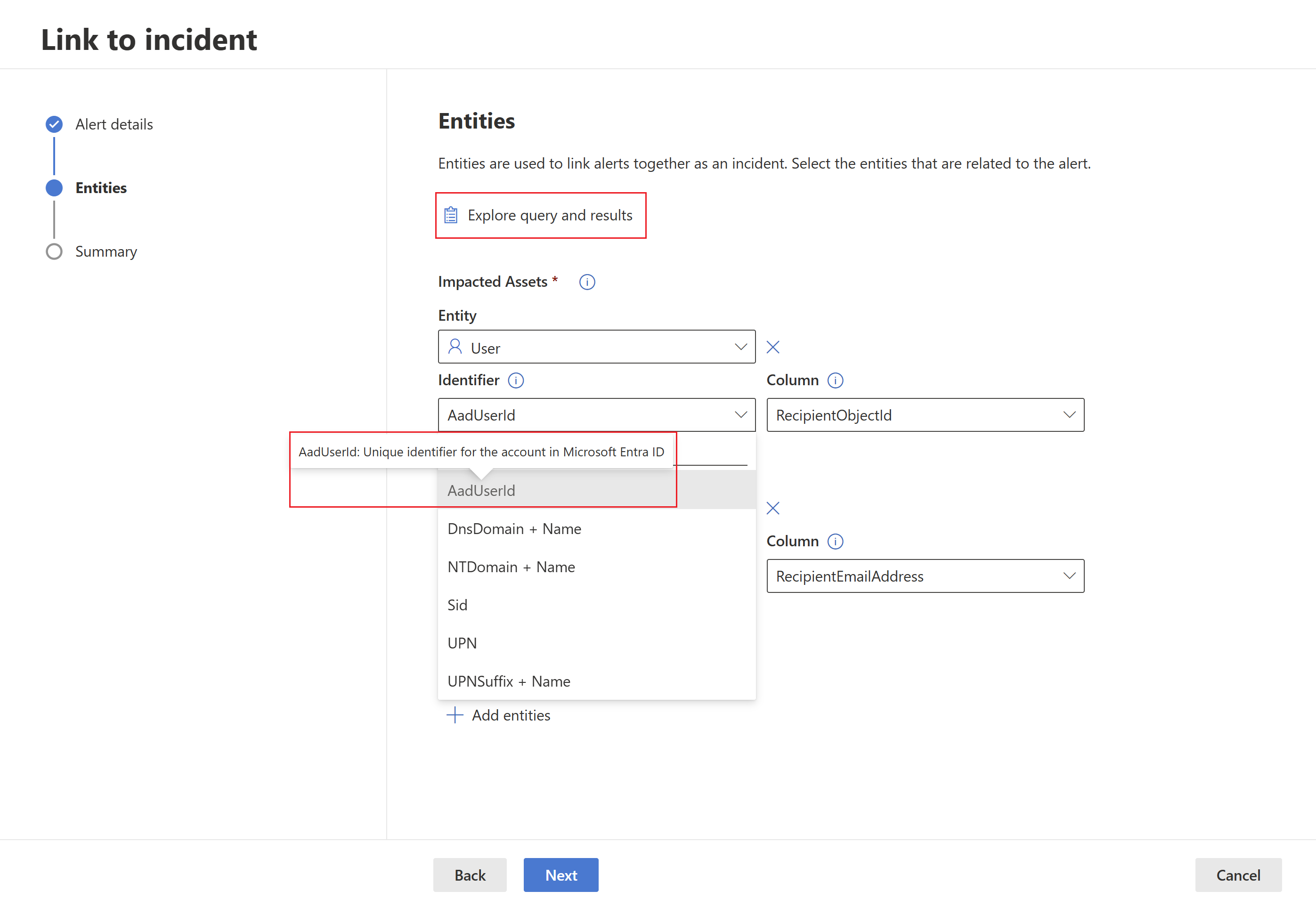 After selecting the identifier, select a column from the query results that contain the selected identifier. You can select Explore query and results to open the advanced hunting context panel. This allows you to explore your query and results to make sure you chose the right column for the selected identifier.