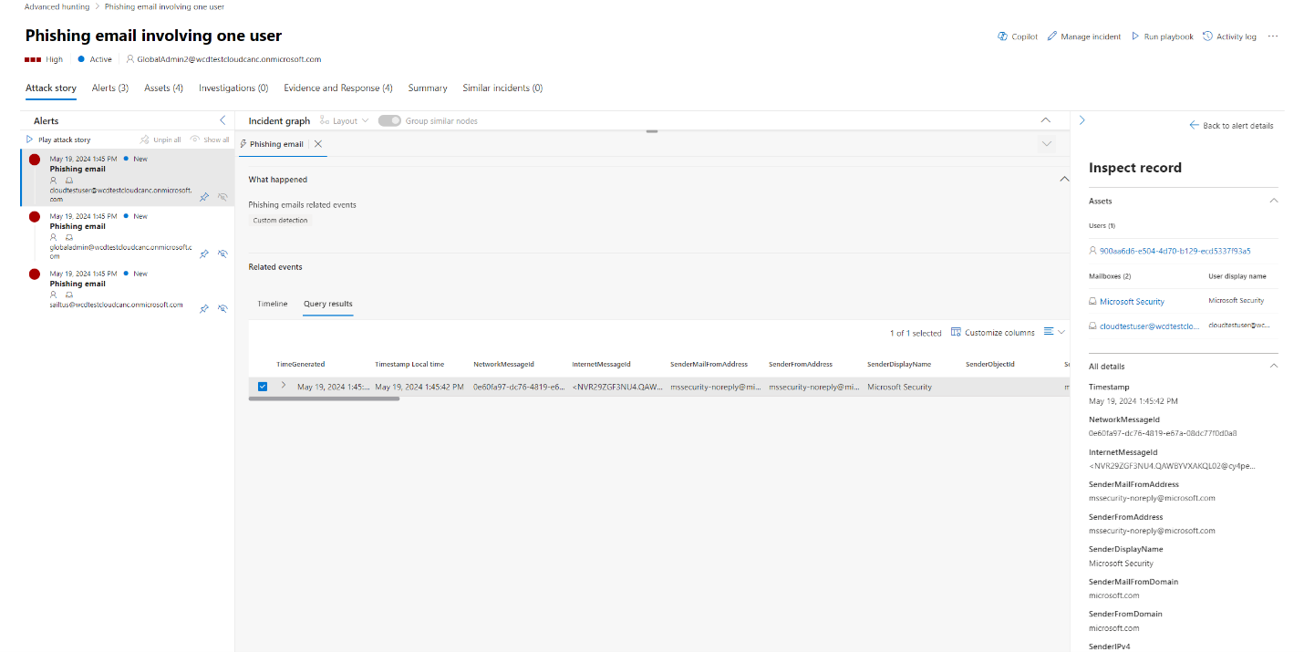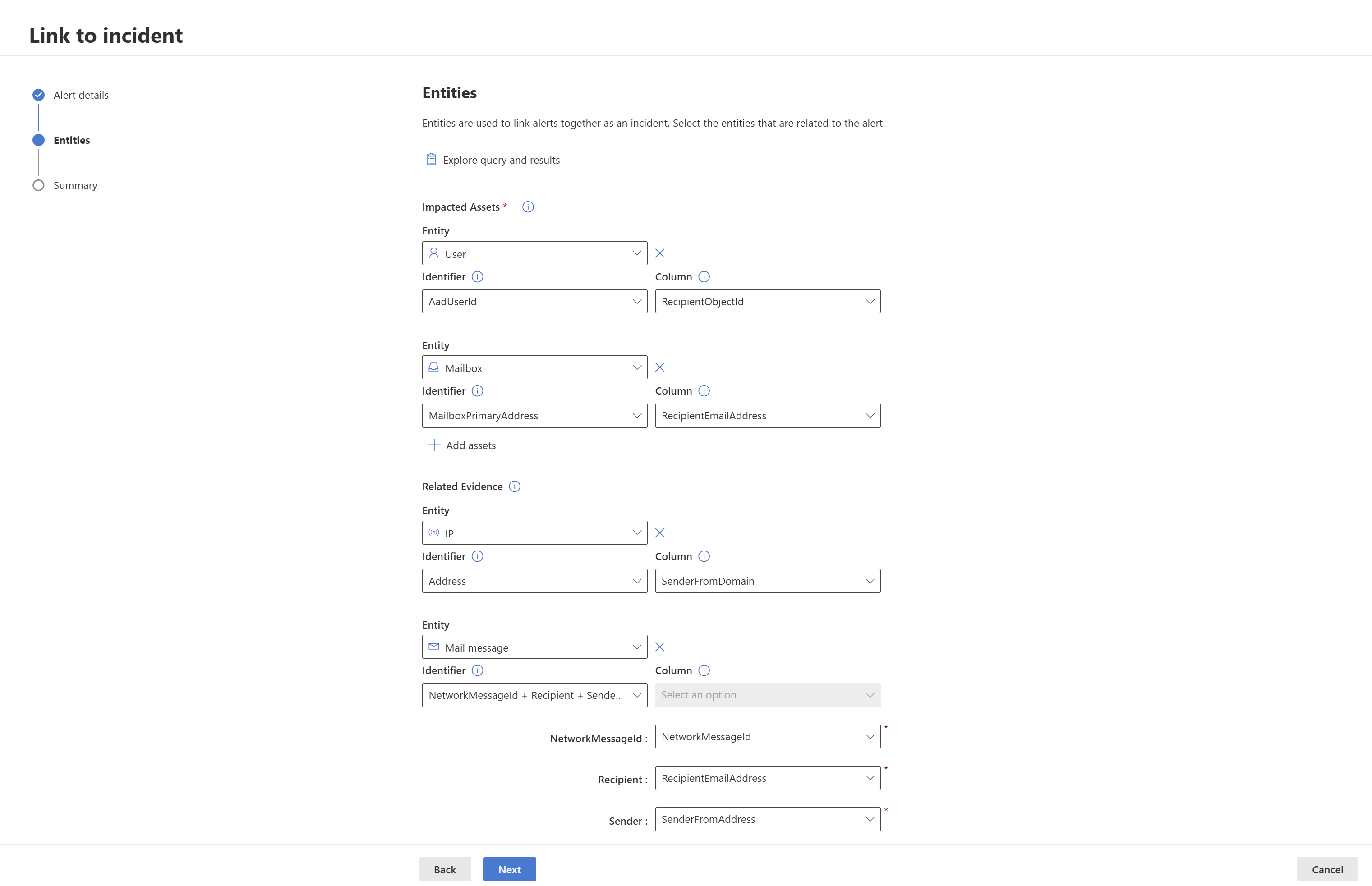 In our example, we used a query to find events related to a possible email exfiltration incident, therefore the recipient's mailbox and recipient's account are the impacted entities, and the sender's IP as well as email message are related evidence.A different alert is created for each record with a unique combination of impacted entities. In our example, if there are three different recipient mailboxes and recipient object ID combinations, for instance, then three alerts are created and linked to the chosen incident.
