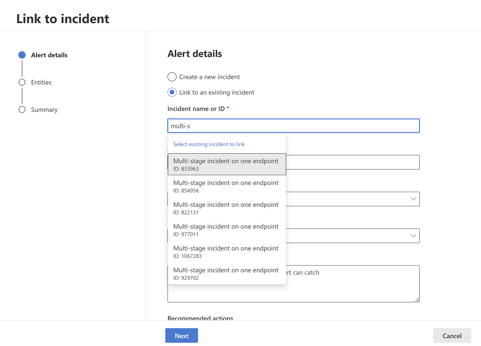 You can also select Link to an existing incident to add the selected records to an existing incident. Choose the related incident from the dropdown list of existing incidents. You can also enter the first few characters of the incident name or ID to find the incident you want.