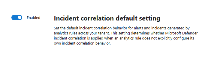 Set the default incident correlation behavior for alerts and incidents generated by analytics rules across your tenant. This setting determines whether Microsoft Defender includes in its correlation engine all analytics rules that don't have their incident correlation behavior explicitly configured.