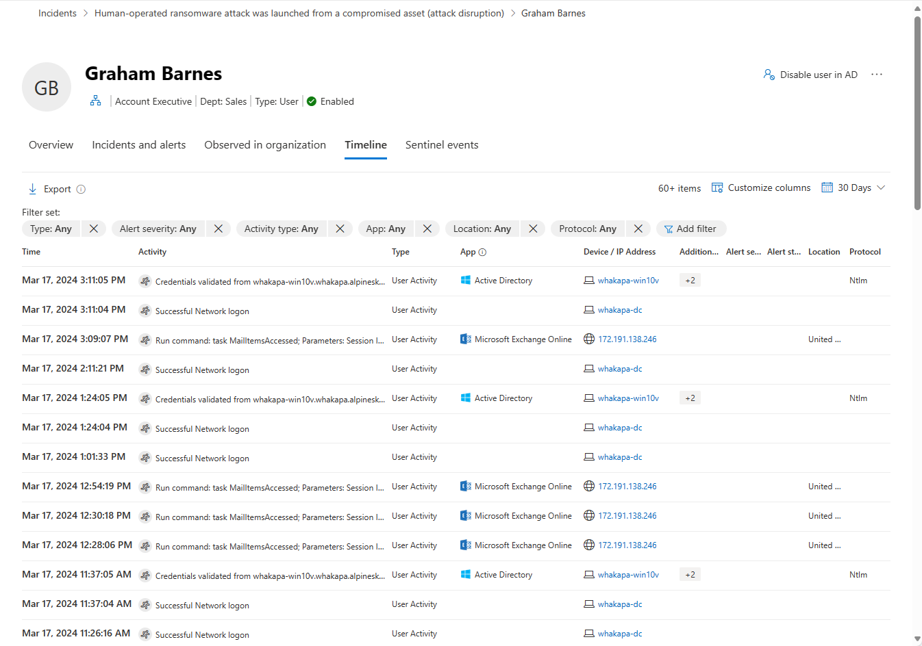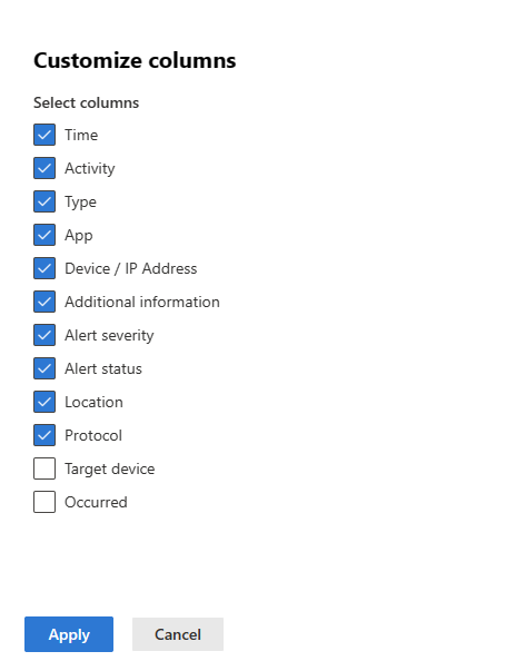 For example:Timeline filters: In order to improve your investigation experience, you can use the timeline filters: Type (Alerts and/or user's related activities), Alert severity, Activity type, App, Location, Protocol. Each filter depends on the others, and the options in each filter (drop-down) only contains the data that's relevant for the specific user.