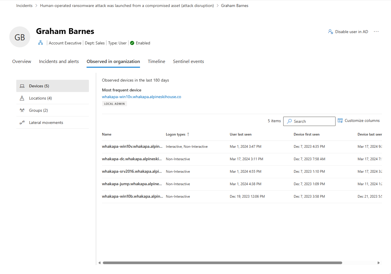 Devices: This section shows all the devices the user entity signed into in the prior 180 days, indicating the most and least used.