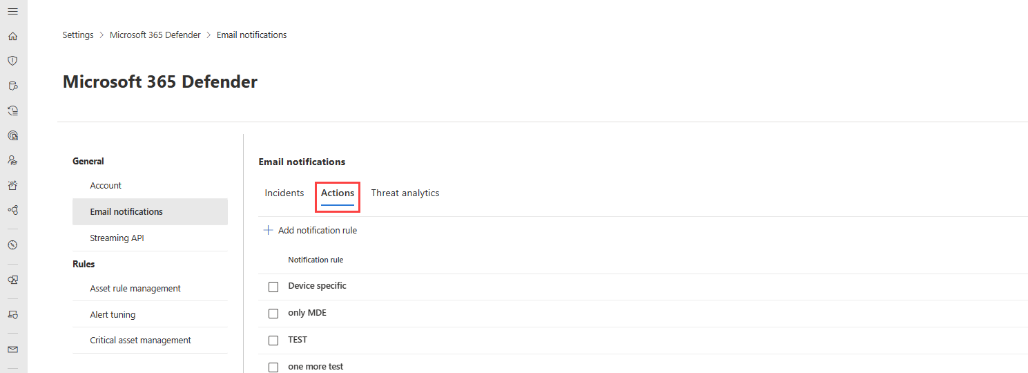 - In the navigation pane of the Microsoft Defender portal, select Settings > Microsoft Defender XDR. Under General, select Email notifications. Go to the Actions tab.