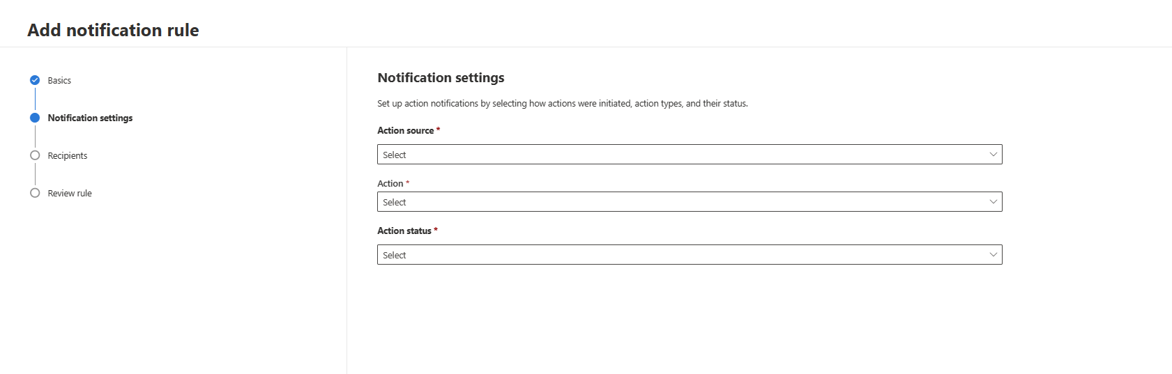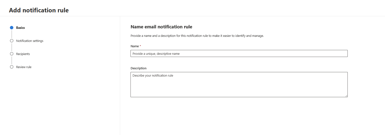 - Select Add notification rule. Add a rule name and description under Basics. Both Name and Description fields accept letters, numbers, and spaces only.