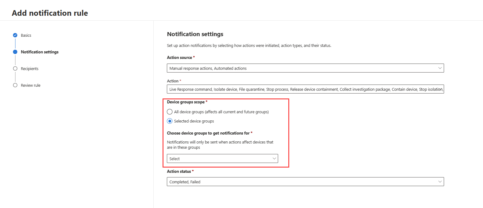 - You can choose to be notified based on the device groups where the response actions are applied in the Device groups scope. To be notified of response actions taken in all current and future device groups, selecting All device groups. To be notified of response actions taken in devices that belong to your selected device group, choose Selected device groups.