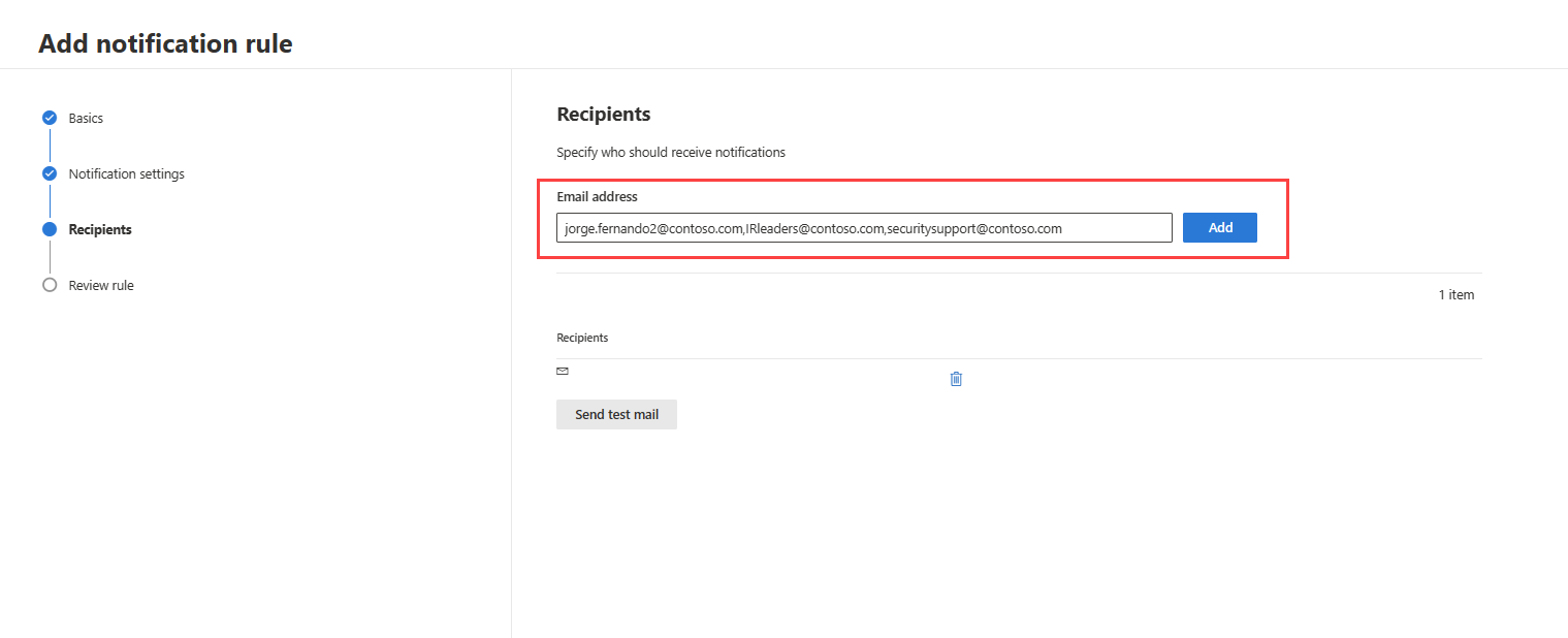 - In the Recipients section, you can add one or more email addresses that will receive notifications. Separate multiple addresses by adding a comma at the end of each address. Select Add to add the recipients. You can see the recipients at the bottom of the pane after successfully adding addresses.