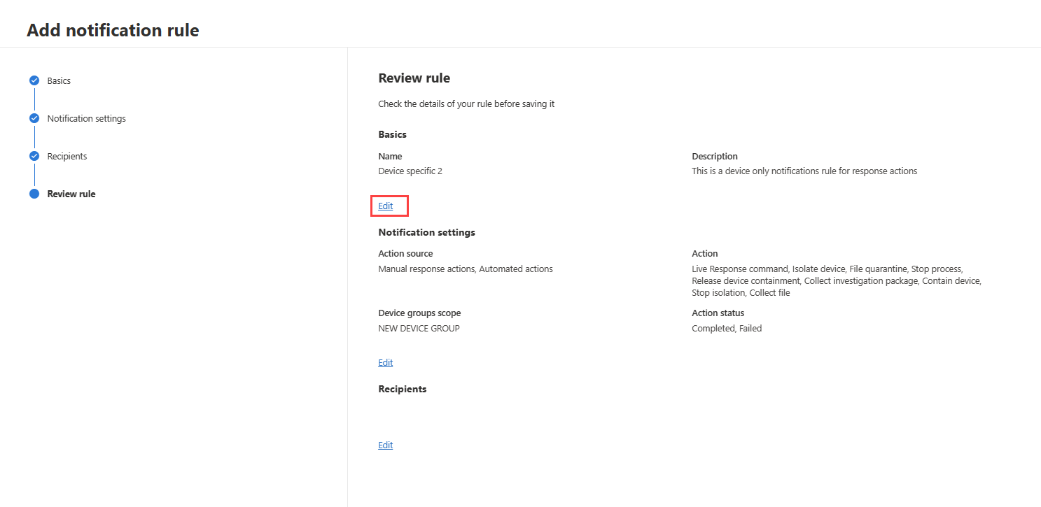 - Check the rule's details in the Review rule section. You can edit the details by selecting Edit under each section's details.
