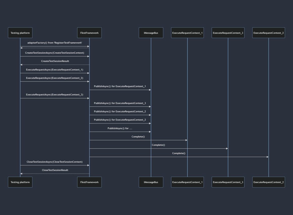 The preceding diagram illustrates that the testing platform issues three requests after creating the test framework instance. The test framework processes these requests and utilizes the IMessageBus service, which is included in the request itself, to deliver the result for each specific request. Once a particular request has been handled, the test framework invokes the Complete() method on it, indicating to the testing platform that the request has been fulfilled.