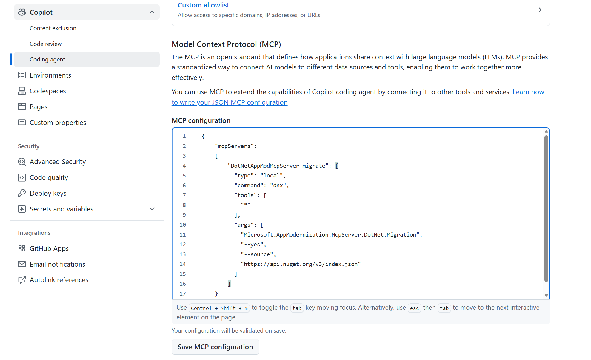 { "mcpServers": { "DotNetAppModMcpServer-migrate": { "type": "local", "command": "dnx", "tools": [ "*" ], "args": [ "Microsoft.AppModernization.McpServer.DotNet.Migration", "--yes", "--source", "https://api.nuget.org/v3/index.json" ] } } }(Optional) If environment variables are required, set them under Environment → Copilot in the settings. These variables initialize automatically the first time an agentic task is invoked in this repository.