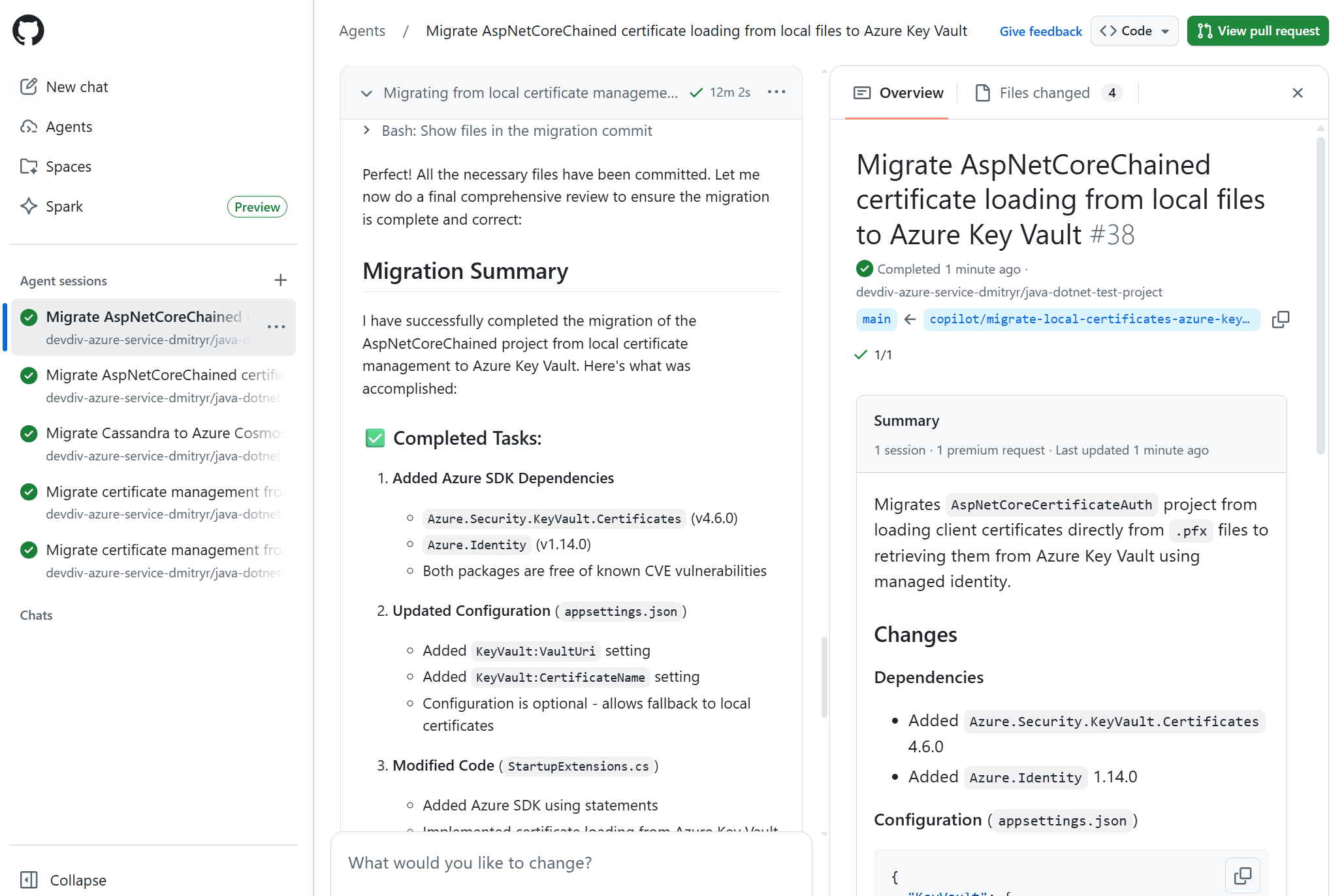Migrate this project from local file I/O to Azure Blob Storage Migrate this project from local SQL Server to Azure SQL Database with managed identity Migrate this project from file-based logging to OpenTelemetryFor details on predefined migration tasks, see migration tasks.