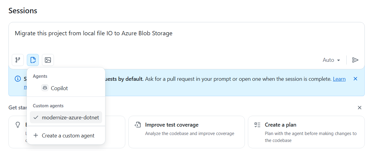target repository, select thecustom agentand enter yourprompt.After you submit it, Copilot starts a new session and opens a new pull request. It appears in the list below the prompt box. Copilot works on the task and adds you as a reviewer when it finishes, triggering a notification.