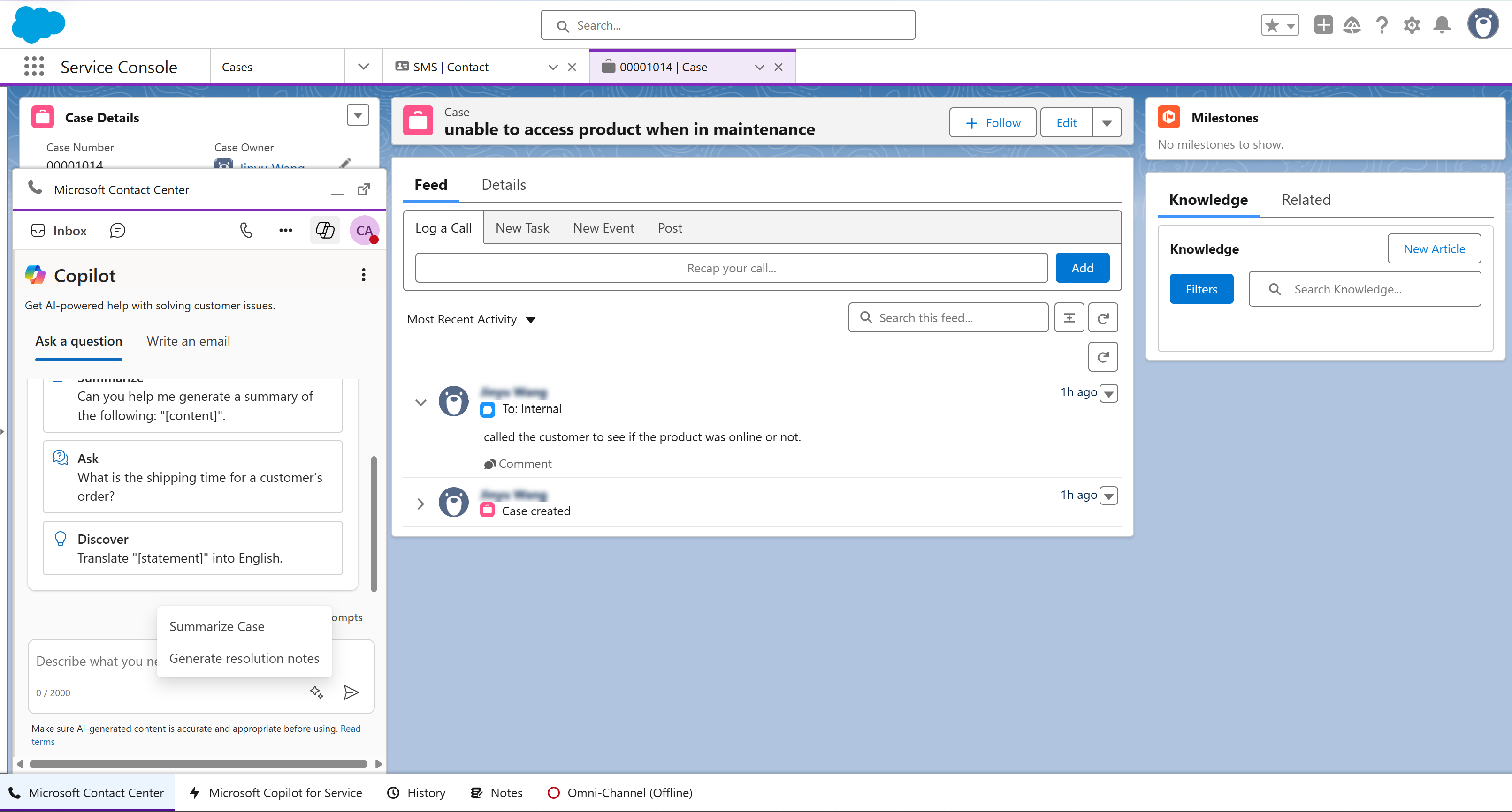 You can also generate case summaries directly within the Ask a question tab. Learn more in Summarize cases in non-Microsoft CRMs.