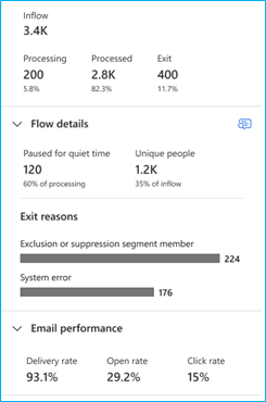 Flow details: The flow details section shows additional details such as rate limits (if applied), unique people who entered the journey (different than inflow, that counts each entry rather than unique people, flow details are only available for channel tiles), and exit reasons. You can select the list icon to display the individuals in the step and reason codes for their status. You can also select the export button to export the data to Excel (with a limit of 50,000 records).